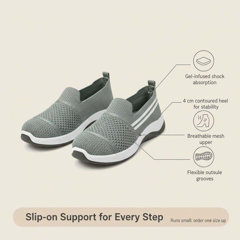 • Gel-infused shock-absorbing sole for cushioned comfort • 4 cm-wide heel base enhances stability • Contoured insole and breathable mesh upper • Flexible grooved outsole for natural movement • Lightweight design and easy slip-on fit (order one size up)